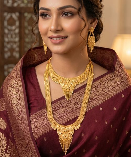 চোখ ধাঁধানো নকশা, অভিজাত দীপ্তি। ৫ বছরের কালার গ্যারান্টি সহ এই দুবাই গোল্ড প্লেট অলংকারে মিলেছে ফ্যাশন আর স্থায়িত্বের সেরা সংমিশ্রণ।