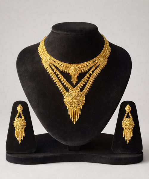 সুন্দরতা যা চিরন্তন, দীপ্তি যা ধরে রাখে বছরের পর বছর। ৫ বছরের কালার গ্যারান্টি সহ এই দুবাই গোল্ড প্লেট অলংকার আপনার সৌন্দর্যে যোগ করবে অভাবনীয় উজ্জ্বলতা।