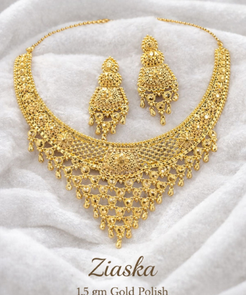 ১.৫ গ্রাম গোল্ড পলিশ করা এই প্রিমিয়াম জুয়েলারি স্বর্ণের দারুণ বিকল্প—লুক, শাইন আর ফিনিশিং এতটাই নিখুঁত যে চোখে দেখে বোঝার উপায় নেই এটা অরিজিনাল স্বর্ণ নয়।